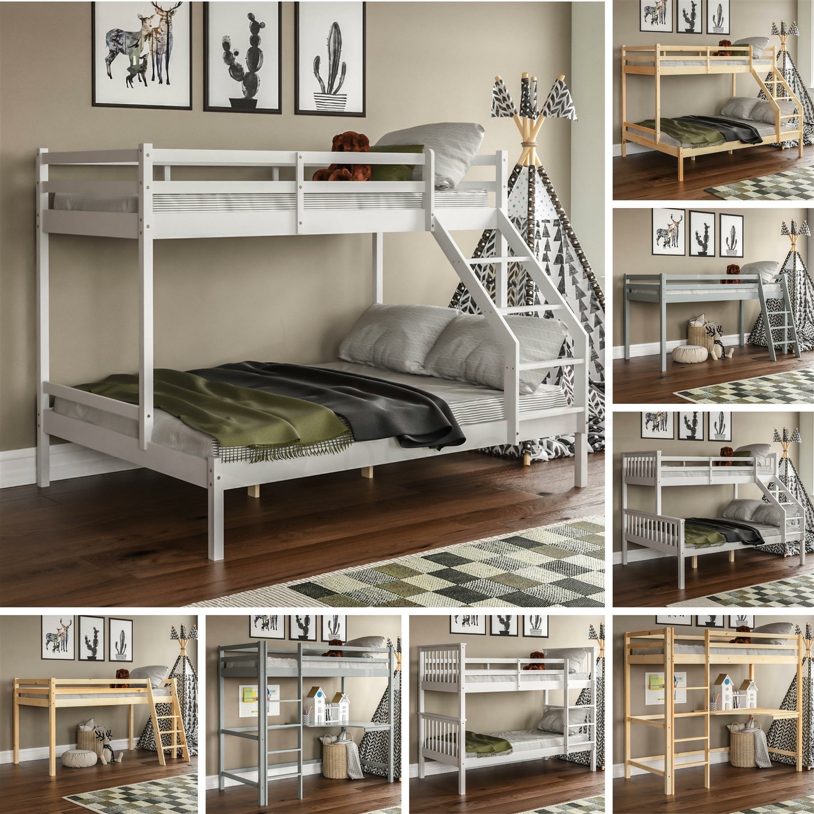 Bunk Bed Triple Sleeper Cabin Loft Bed Solid Wood Frame Desk Kids Childrens
